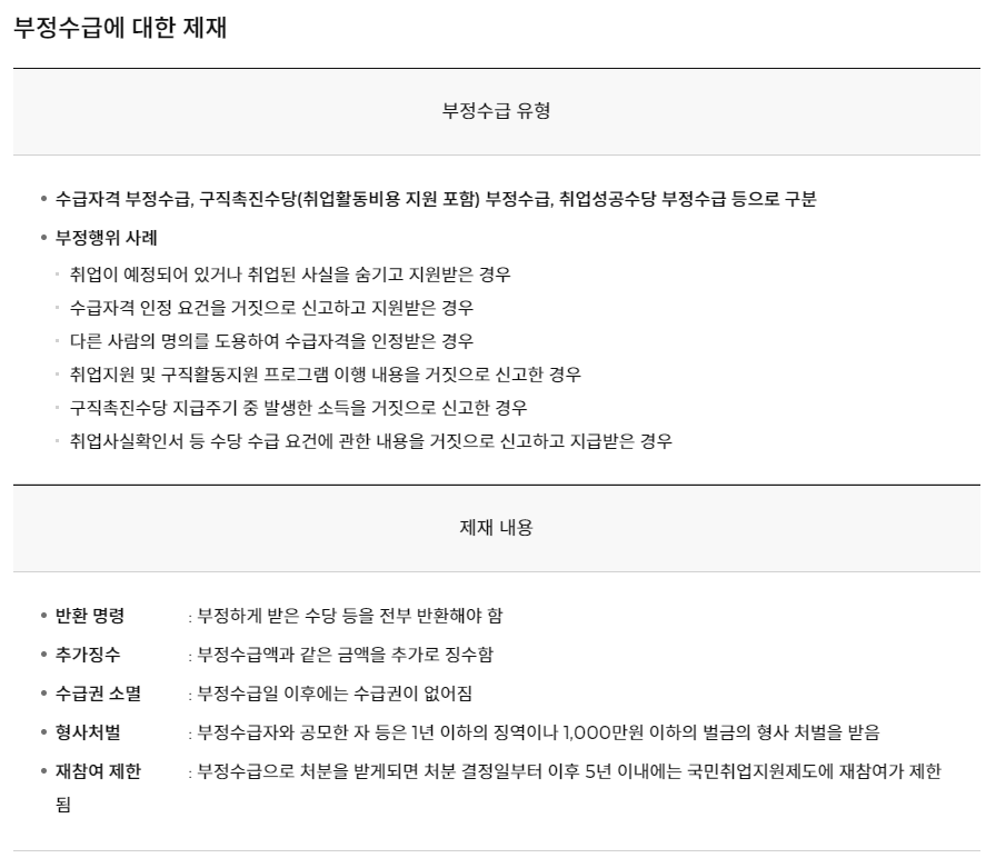정당한 사유 없이 취업활동계획을 따르지 않거나 계획의 일부 또는 전부를 이행하지 않으면 지급주기의 구직촉진수당 지급이 중단되거나 감액됩니다.(지급되지 않거나 감액 지급된 수당은 지급된 것으로 간주하며 나중에도 지급되지 않습니다) 신고 의무를 사실대로 이행하지 않고 거짓이나 부정한 방법으로 신고하고 구직촉진수당 등을 수급하면 법률에 따라 부정수급으로 제재를 받을 수 있습니다.